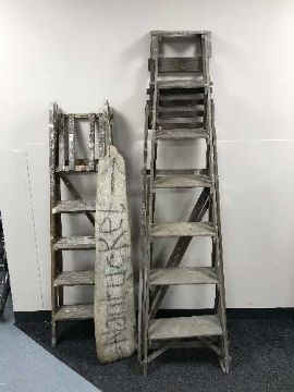 Two sets of folding wooden step ladders and a piece of driftwood