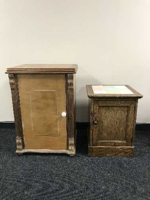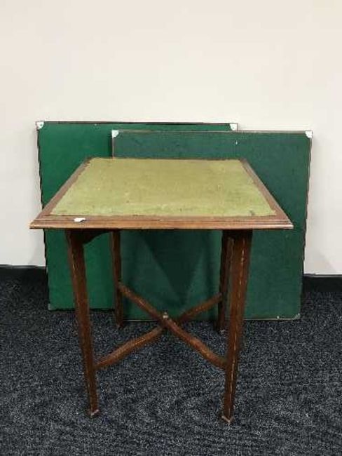 An oak tiled pot cupboard, sewing machine cabinet, four card tables and a drop leaf table