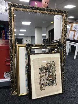 A gilt framed over mantel mirror, gilt mirror, Egyptian print and gilt framed Bruce Clint print