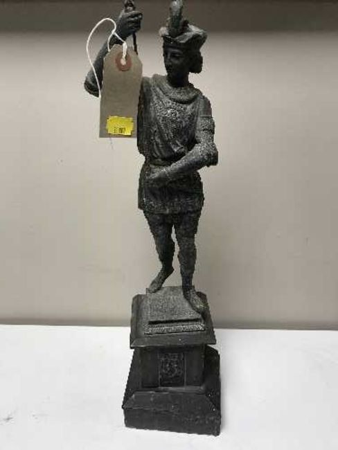 A spelter figure in 18th century dress on a marble plinth