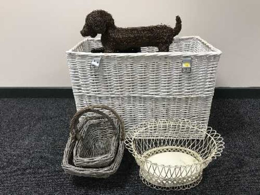 A large wicker hamper containing wicker and metal baskets, wall rack, table linen etc