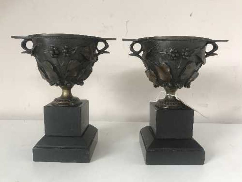 A pair of bronze urns on marble plinths with embossed leaf and vine decoration (2)