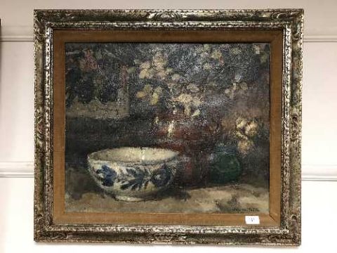 Alfred Joseph Auguste Van Neste (Belgian 1874-1969) : Still life with with pottery on a ledge, oil on canvas, signed, 50 cm x 60 cm, framed.