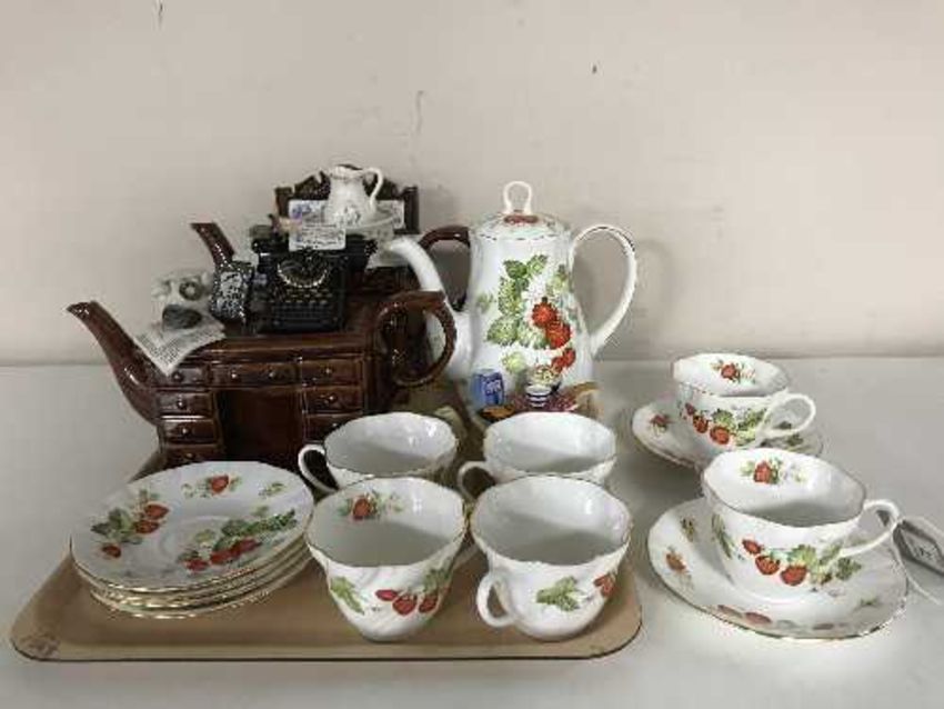 A tray of thirteen piece Queens Virginia Strawberry tea service and two Paul Cardew novelty teapots