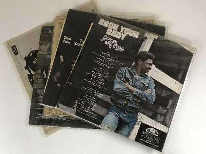 A box of LP records and 45's - U2, The Beatles, Elton John etc