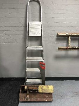 Set of extension ladders, wooden ladders, tool box, tools etc