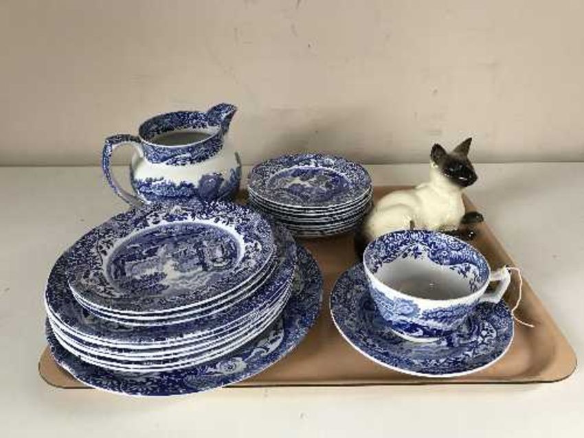 A tray of Beswick Persian cat and twenty two pieces of Copeland Spode china