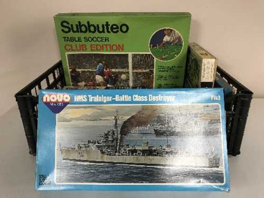 A box of Subbuteo table soccer edition, modelling kits inc. Airfix Cutty Sark, Revel Sikosky helicopter etc