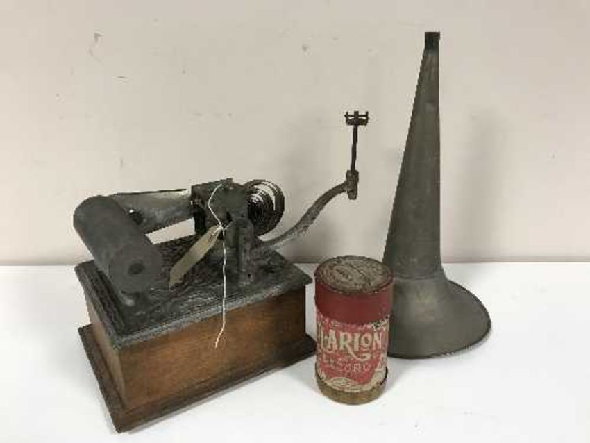 An Edison Phonograph with winding key and horn retailed by A. C. Smith of Lincoln, six Edison reel boxes (five of which have reels)