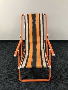 A folding metal deck chair
