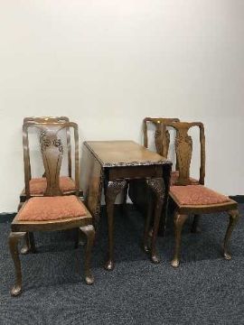 A walnut Queen Ann style drop leaf table together with four oak chairs