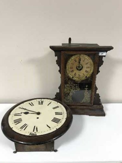 An early 20th century oak school clock and a pine cased American Seth Thomas mantel clock