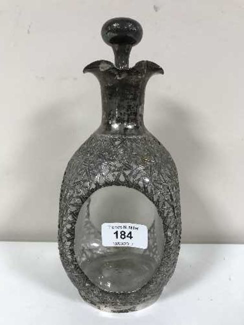 A Chinese silver mounted decanter and stopper, maker Lee Yee Hing, of dimpled square form, the silver mount with pierced bamboo decoration and flared collar, 24.5cm