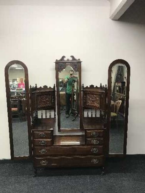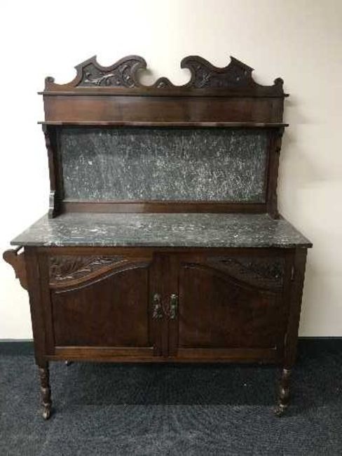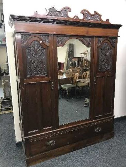 A three piece carved mahogany bedroom suite comprising of mirrored wardrobe, sunk centred dressing table and marble topped washstand