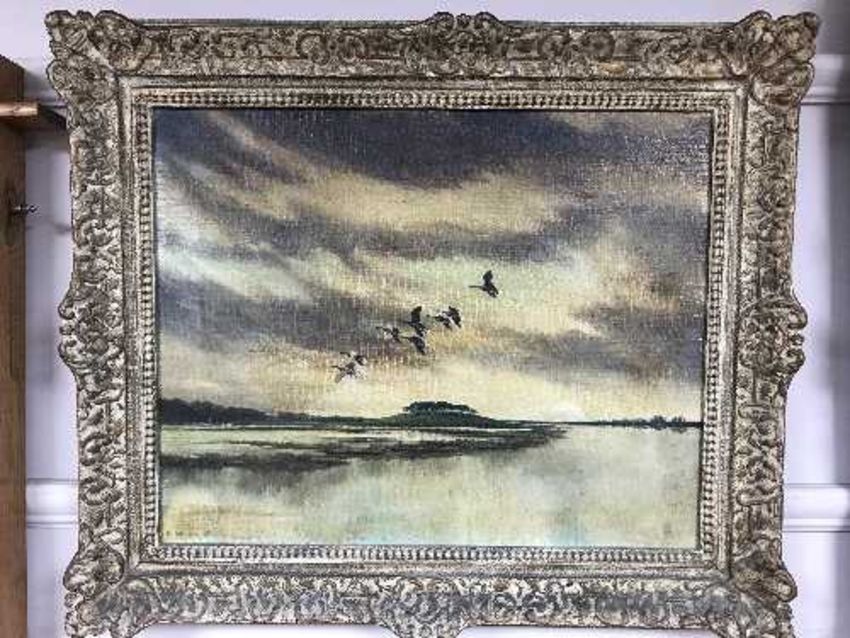 Robert Jobson : Greylags over a river, oil on canvas, signed, dated '51, 40 cm x 50 cm, framed.