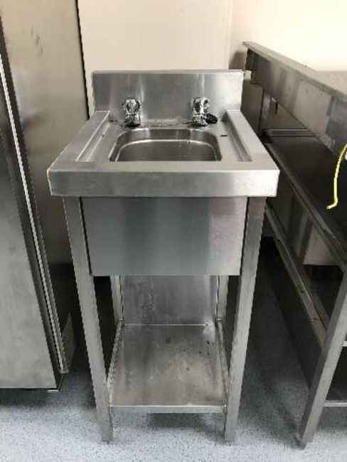 A stainless steel single sink unit with shelf