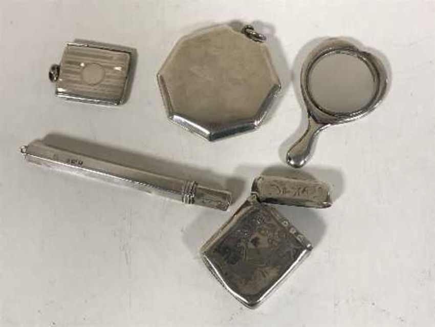 A group of silver to include vesta case, miniture hand mirror, stamp case etc (5)