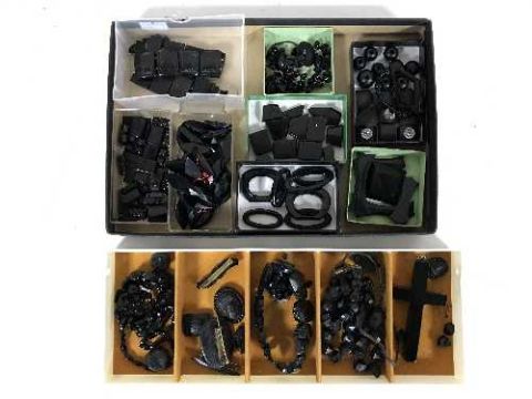 A basket of Whitby Jet jewellery inc. bracelets, necklaces, brooches etc
