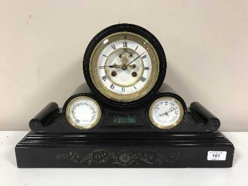 A Victorian black slate mantel clock with enamelled dial thermometer & barometer apertures