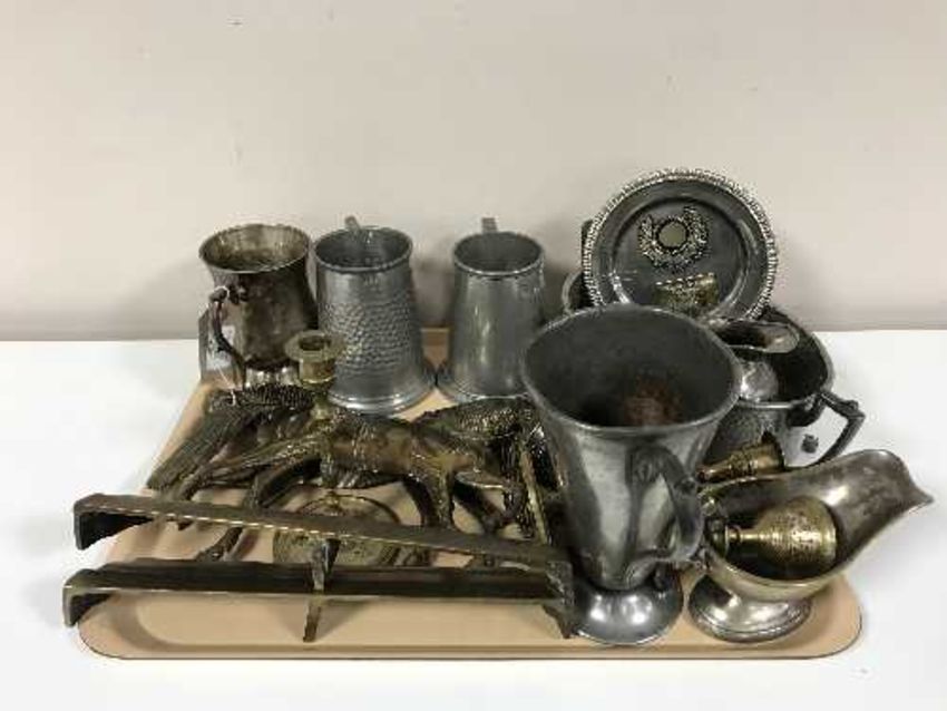A tray of 20th century metal ware inc. Tudor pewter, brass candlesticks, pair of horse door stops etc