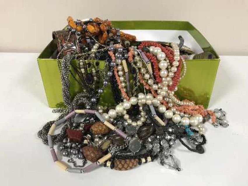 A box of costume and silver jewellery, two hand mirrors, brass miner figure etc