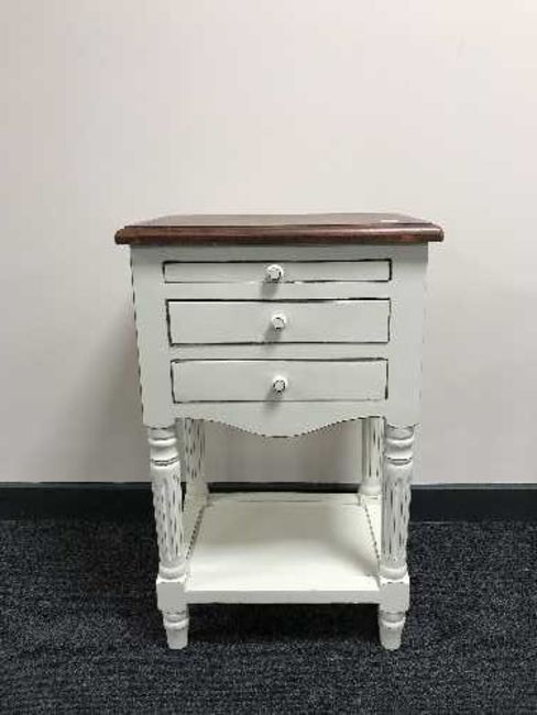 A white side table fitted three drawers