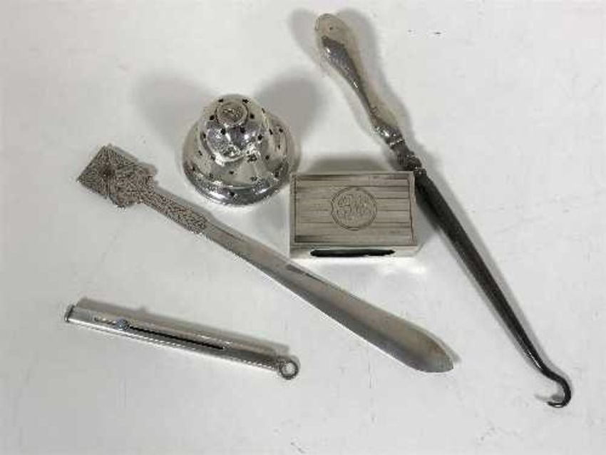 A group of silver to include a matchbox holder, pin-stand, button hook etc (5)