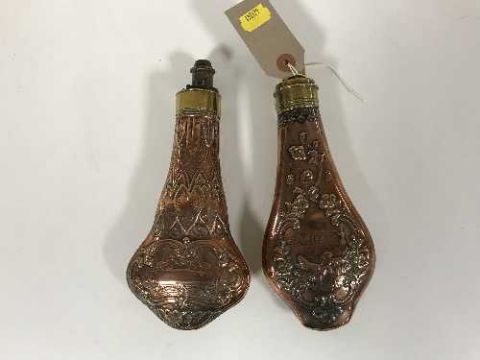 Two embossed copper and brass shot flasks
