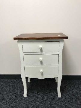 A white three drawer bedside chest with pine top