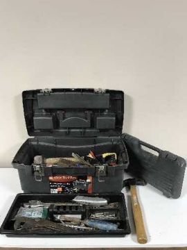 A basket and tool box of assorted hand tools, power tools etc together with a set of vintage scales and weights