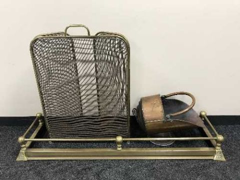A twentieth century fire curb, three way folding spark guard and antique copper coal receiver
