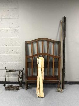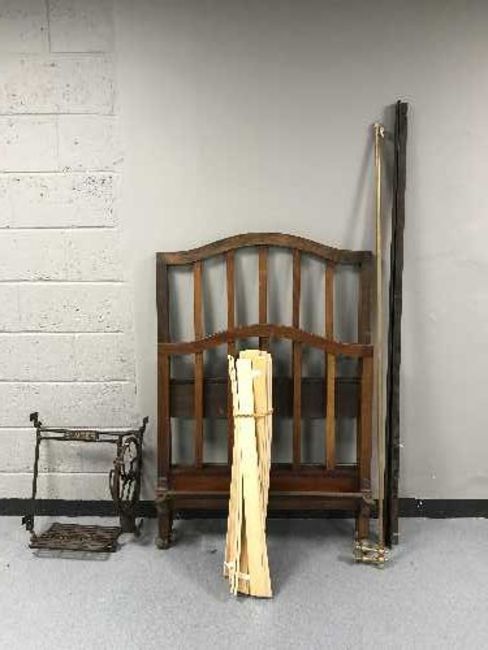 An antique mahogany 3' rail bed frame together with a brass pole with fittings and Singer treadle sewing machine mechanism