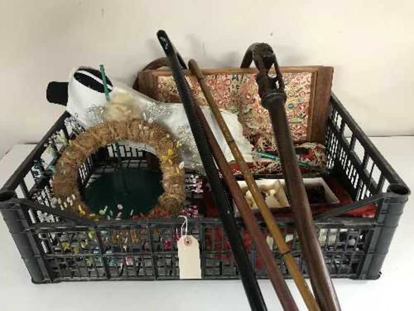 A box containing woollen hearth rug, miniature mannequin on stand, walking sticks, wooden tray with cigar wrapper decoration