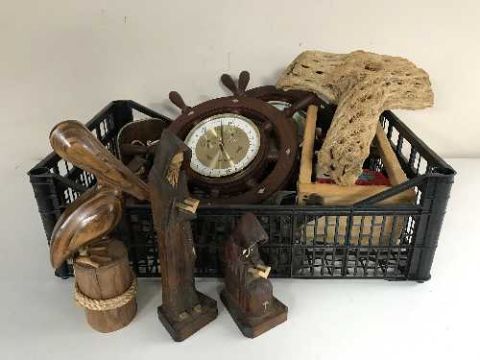 A basket of wooden ornaments, wooden bookend, a ship's wheel wall clock and barometer
