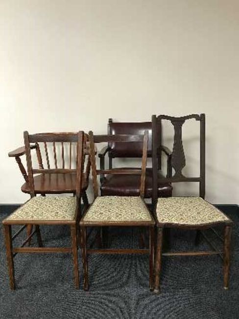 Three early 20th century inlaid mahogany bedroom chairs together with a pine armchair and a red leather office armchair