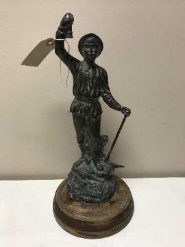 A bronze figure of a miner on a wooden base