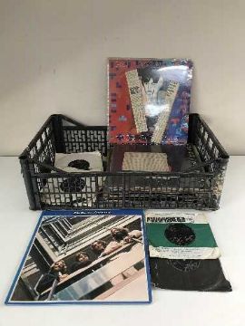 A crate of LP records and 45's all relating to The Beatles inc. Revolver, Hard Days Night, etc and a wallet containing Paul McCartney & Wings concert ticket stubs dated 1973