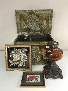 A brass embossed coal box of framed tile, oil lamp, candles holders etc