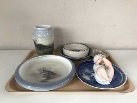 A tray of German porcelain figure of a baby, Royal Copenhagen bowl, vase and 1972 Olympic plate etc