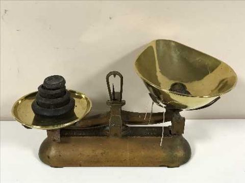 A set of vintage W. T & T. Avery kitchen scales with brass pans and weights