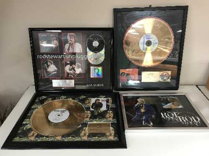 A framed Michael Jackson Bad gold disk, ltd edition, 241/250 together with a Meatloaf Bat out of Hell presentation disk number 42/250, a Rod Stewart Unplugged presentation disk and a Rod Stewart 'The Story So Far' CD with signed photograph, all framed (4)