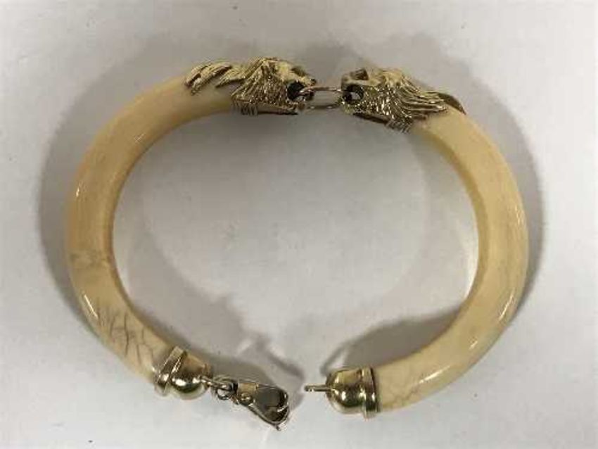 A 1920's two-piece ivory bangle, with 9ct gold mounts formed as lions with ruby set eyes