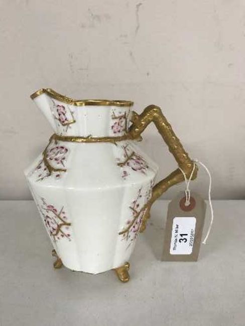 A Beleek jug decorated with pink flowers and gilding, height 16 cm