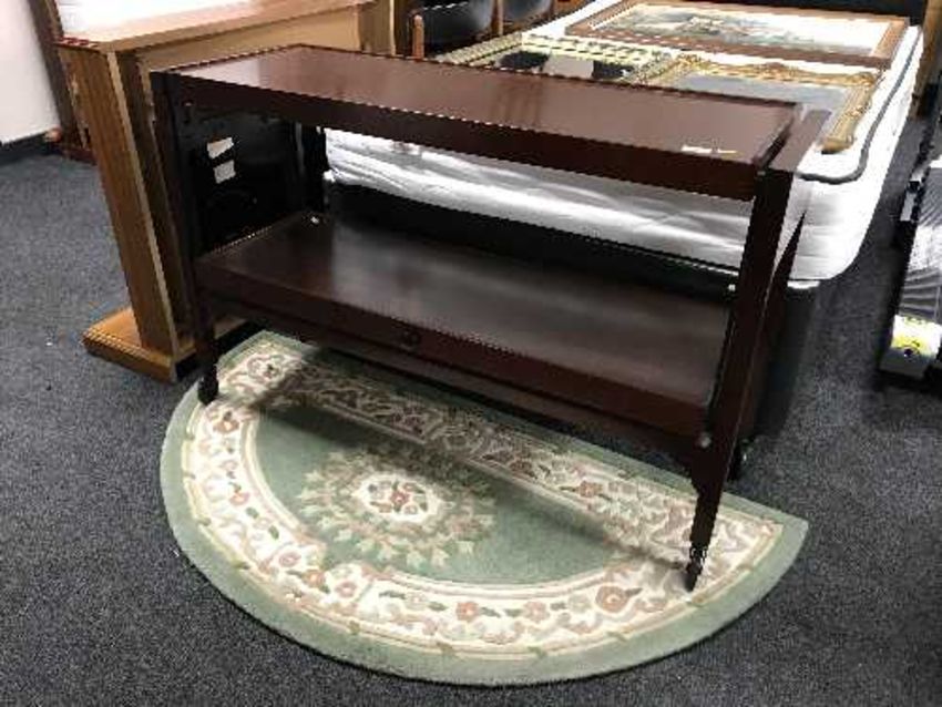 A mahogany two-tier dumb waiter, an onyx table lamp and a d-shaped green woollen rug