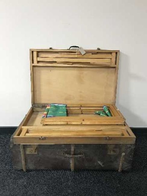 An early 20th century oak bound trunk together with a folding picnic table with stools