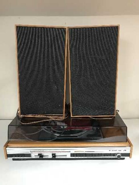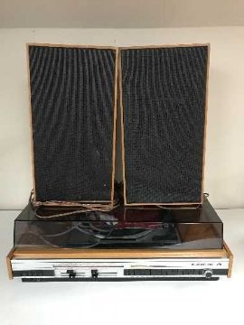 A HMV stereo system with Garrard turntable, pair of speakers and stands