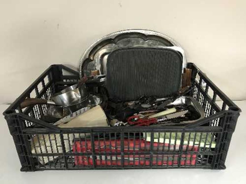 A crate of a large quantity of stainless steel flatware, together with a wicker picnic basket containing four wooden rolling pins