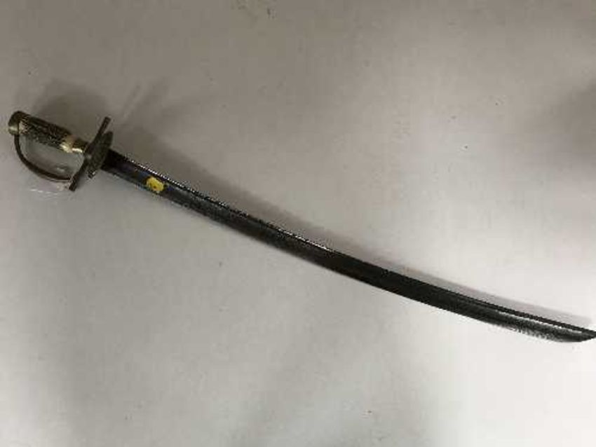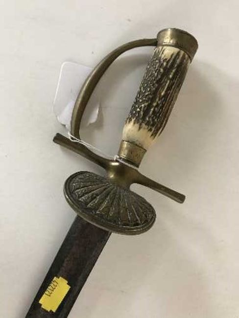 A 19th century hunting sword or hanger, probably German, with 68cm curved and etched blade, antler grip and brass shell guard with knucklebow