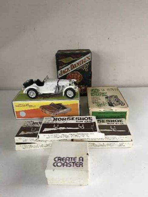 A box of Jack Daniels Texas Holdem set, five boxed horse shoe gun racks, die cast Burago model of a Mercedes Benz, boxed Cadillac Solid State Radio