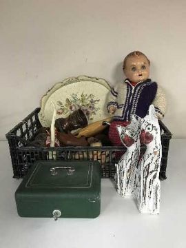 A crate containing cash box with key, wooden cat ornaments, 1950's doll, child's tea service etc